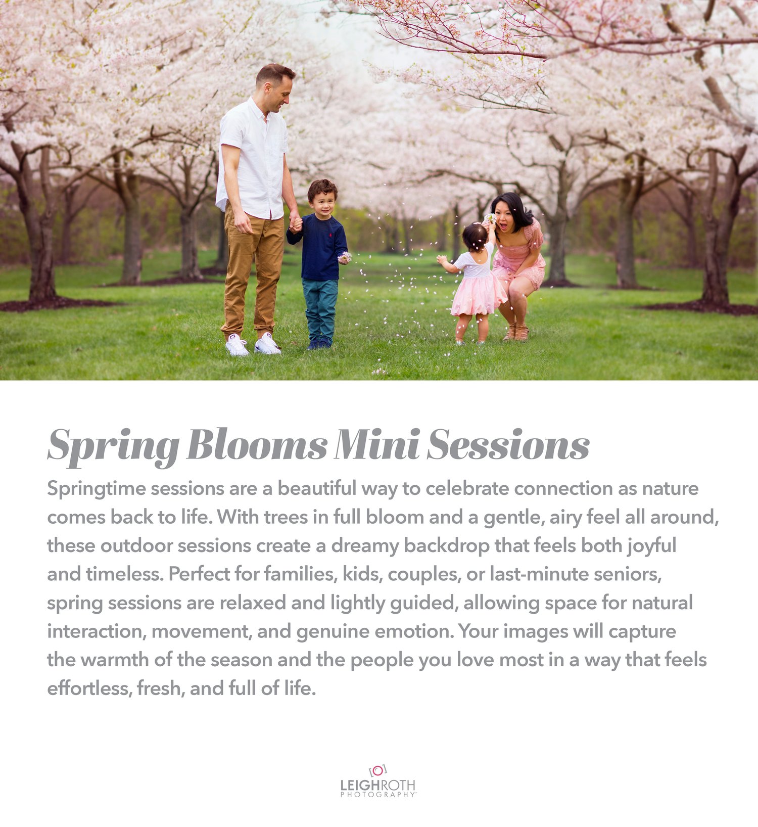 Springtime sessions are a beautiful way to celebrate connection as nature comes back to life. With trees in full bloom and a gentle, airy feel all around, these outdoor sessions create a dreamy backdrop that feels both joyful and timeless. Perfect for families, kids, couples, or last-minute seniors, spring sessions are relaxed and lightly guided, allowing space for natural interaction, movement, and genuine emotion. Your images will capture the warmth of the season and the people you love most in a way that feels effortless, fresh, and full of life.