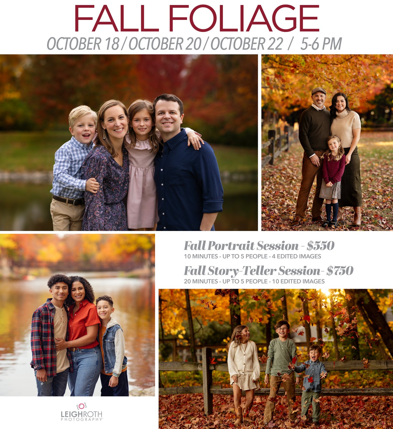 The Fall Foliage Mini Session includes professionally retouched, high-resolution digital images selected by Leigh Roth Photography. Final images will be delivered via digital download.