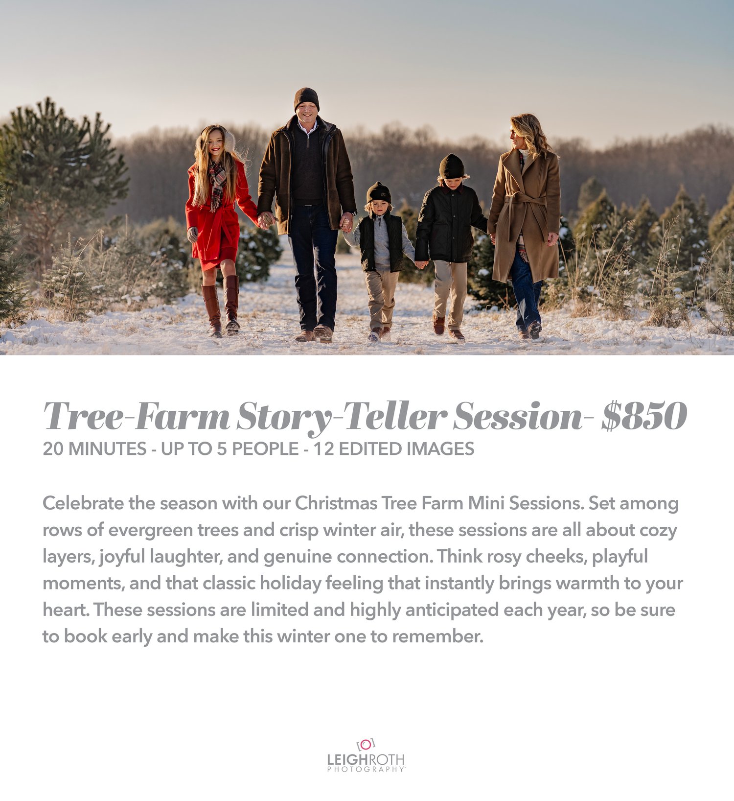 Celebrate the season with our Christmas Tree Farm Mini Sessions. Set among rows of evergreen trees and crisp winter air, these sessions are all about cozy layers, joyful laughter, and genuine connection. Think rosy cheeks, playful moments, and that classic holiday feeling that instantly brings warmth to your heart. These sessions are limited and highly anticipated each year, so be sure to book early and make this winter one to remember.